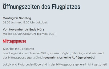 Beachtet: Mittags 12:00 Uhr bis 13:30 Uhr Ortszeit sind nur Landungen aber keine Abflüge gestattet!